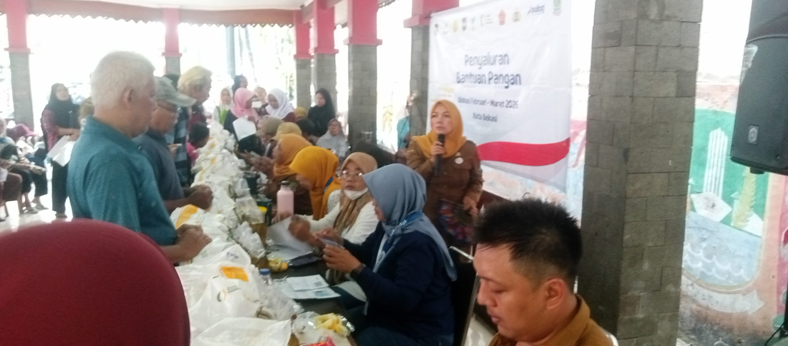 PSM Jatiwaringin membantu memanggil nama penerima, sementara staf kelurahan mengatur alur antrean.